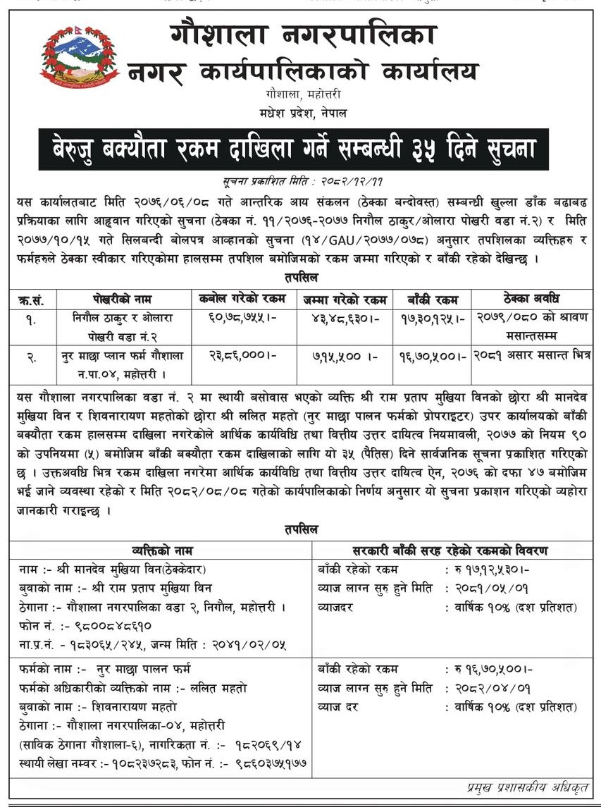 बेरुजु बक्यौता रकम दाखिला गर्ने सम्बन्धी ३५ दिने सूचना !