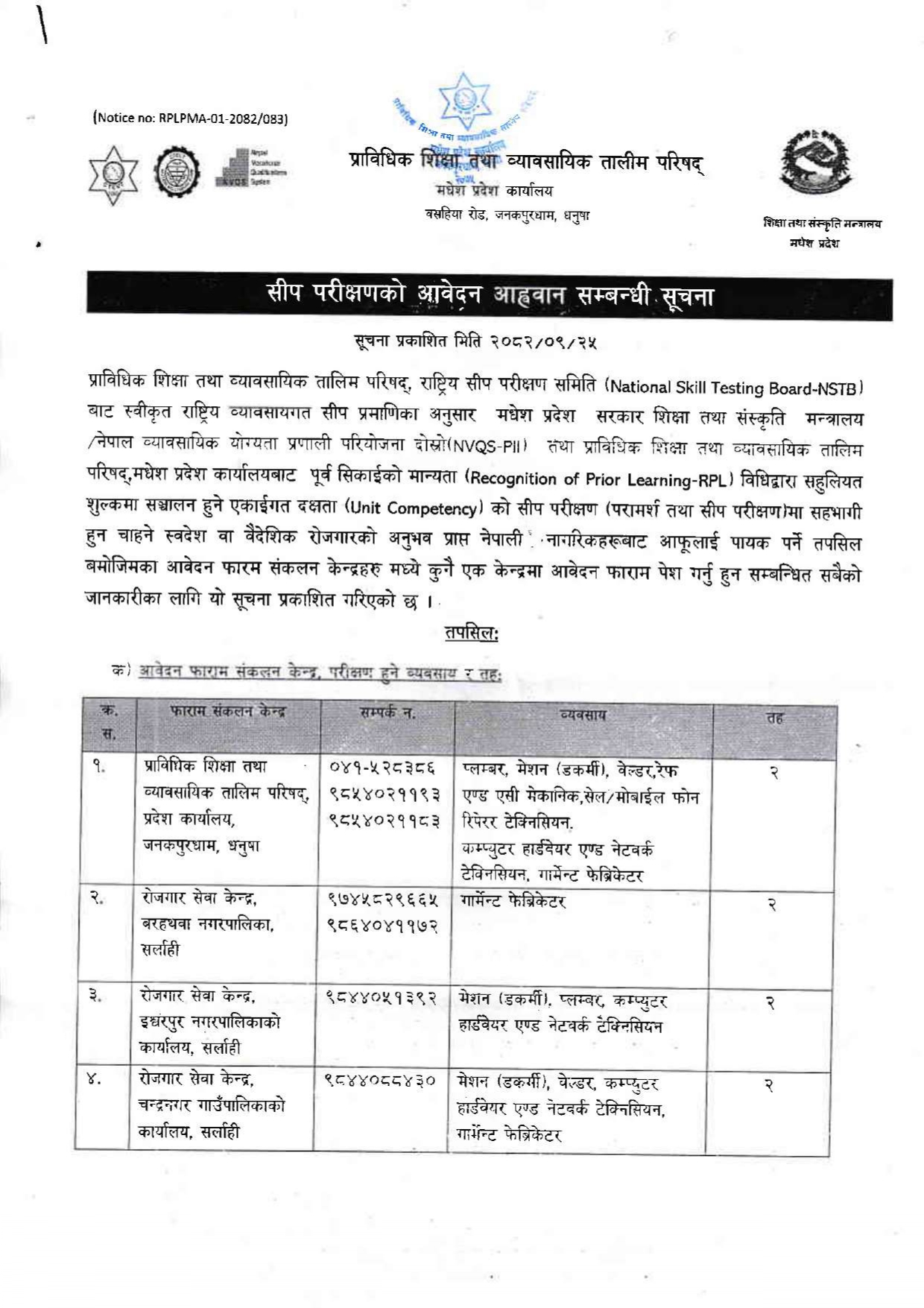 प्राविधिक शिक्षा तथा व्यवसायिक तालिम परिषद, मधेश प्रदेशको सीप परीक्षणको आवेदन आह्वान सम्बन्धी सूचना !