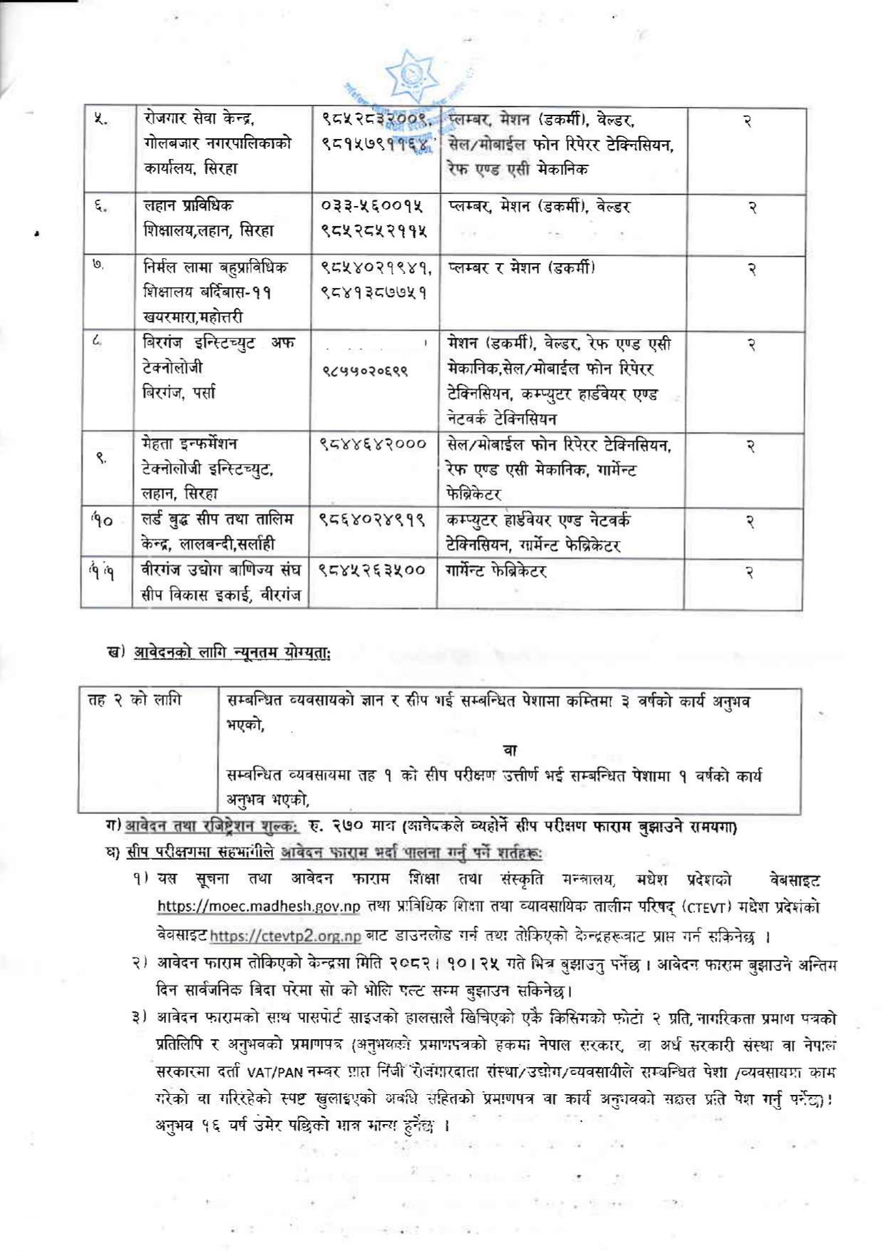 » प्राविधिक शिक्षा तथा व्यवसायिक तालिम परिषद, मधेश प्रदेशको सीप परीक्षणको आवेदन आह्वान सम्बन्धी सूचना !
