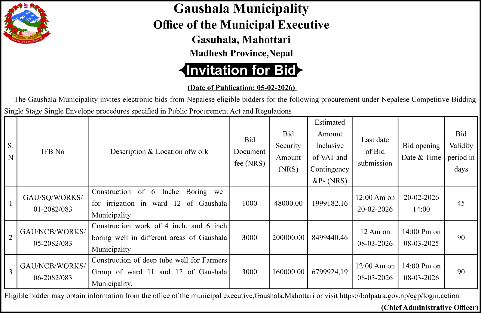 Invitation For Bid: Construction of PCC Roads in Ward 8 of Gaushala Municipality.