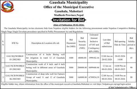 Invitation For Bid: Construction of PCC Roads in Ward 2 of Gaushala Municipality.