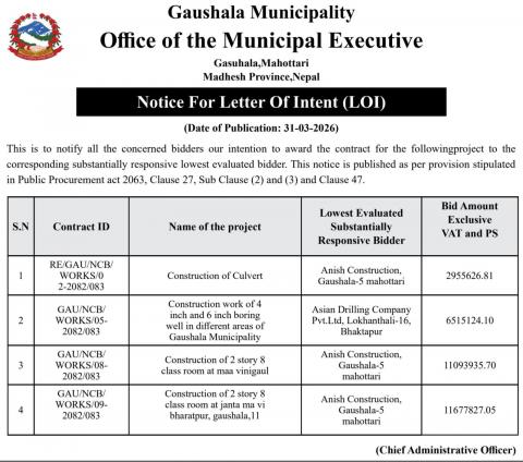 नदीजन्य पदार्थको उत्खनन, संकलन तथा बिक्रि बितरणका लागि बोलपत्र सम्बन्धी सूचना !